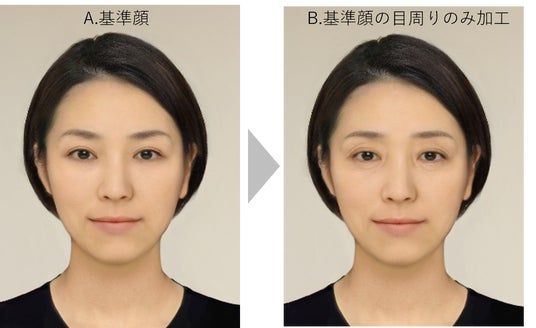 試験に同意を得た18~82歳の女性272名(平均49.1歳)の顔画像(正面、真顔)から、顔の大きさと位置をそろえた画像を作成し解析したところ、加齢によって目の縦幅が小さくなることが明らかとなりました(図1)。そこで目周りの変化が顔全体に与える影響を確認するため、主に目の縦幅を縮小した画像を作成し、400名の女性に見た目年齢を評価していただきました。評価平均年齢が基準顔(図2A)では35歳であったのに対し、目の縦幅を小さくした図2Bは46.5歳でした。このことから、加齢による目の縦幅の縮小などの目周りの変化があると、顔全体の印象が老けて見えることが明らかとなりました。
