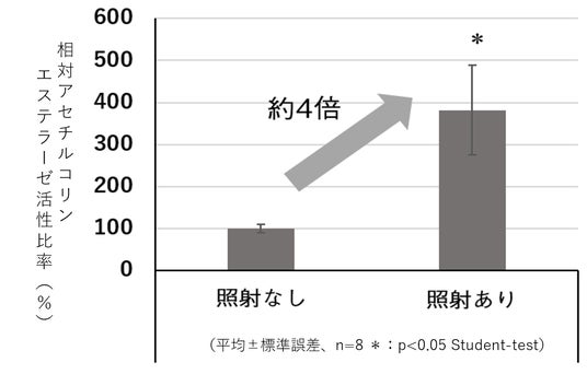 ヒト筋管細胞に対し、ブルーライトを照射することで細胞内で産生されるアセチルコリンエステラーゼ活性を測定しました。ブルーライトを8 J/平方センチメートル照射することで非照射群と比較して細胞内アセチルコリンエステラーゼ産生が有意に増加することが明らかとなりました。