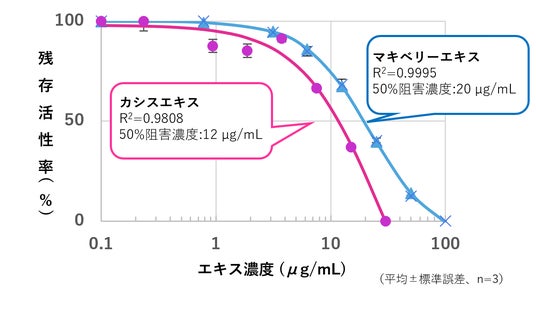 この研究に着想を得て、電子機器使用によるブルーライトの影響に着目した研究を実施しました。電子機器から発せられるブルーライトの影響で神経伝達物質を分解するアセチルコリンエステラーゼが過剰に活性化することが明らかとなりました(補足資料1)。さらにアセチルコリンエステラーゼの活性を抑える植物エキスを発見しました(補足資料2)。植物エキスを含有するサプリメントを摂取する試験においてマキベリーエキス、カシスエキスを摂取したところ、まぶたの重たさや目の開けにくさに関する自覚項目を改善する結果が得られました(補足資料3)。