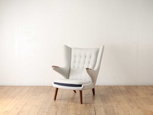 HANS J. WEGNER ベアチェア AP19Hans J. Wegner(ハンス・J・ウェグナー)がデザインした、デニッシュヴィンテージ家具における代表的なアイコンピースとして知られる『パパベアチェア』。熊が手を広げている様な佇まいに形容されており、現在ではPPモブラー社で現行品がつくられています。こちらはヴィンテージの個体であり、現在ではマーケットにおける希少価値がさらに高まったAPストーレン製の1脚です。