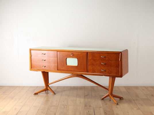 イタリアンサイドボード建築物を連想させる2本の台座型レッグのシェイプが美しく、中央のフラップ式扉内は、背面にはミラーとU字型ガラス棚板が設えてあります。グラスボトルやカラフェ、カクテルグラス等を美しく収納できる仕様。ヘリンボーン柄の木目模様が特徴的であり、全体のフォルムから細部まで非常に拘ったイタリアらしいユニークかつアートを感じられるデザインのサイドボードです。