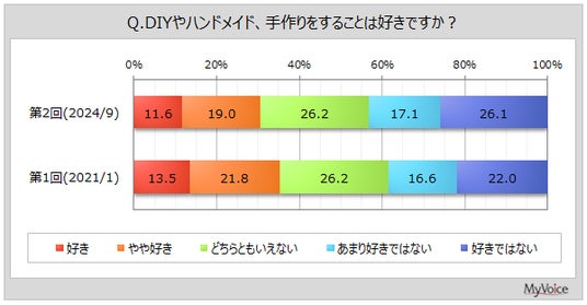 マイボイスコム株式会社(東京都千代田区、代表取締役社長:高井和久)は、2回目となる『DIY・ハンドメイド』に関するインターネット調査を2024年9月1日~7日に実施しました。