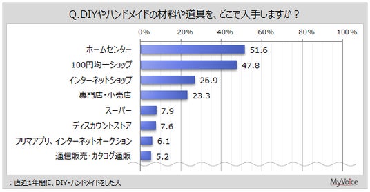 DIY・ハンドメイドの材料や道具を入手する場所は(複数回答)、「ホームセンター」「100円均一ショップ」が直近1年間にDIY・ハンドメイドをした人の5割前後、「インターネットショップ」「専門店・小売店」が各20%台となっています。