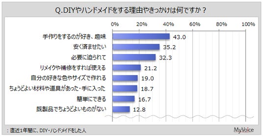 直近1年間にDIY・ハンドメイドをした人に、手作りをする理由・きっかけを聞いたところ(複数回答)、「手作りをするのが好き、趣味」が43.0%、「安く済ませたい」「必要に迫られて」が各30%台となっています。