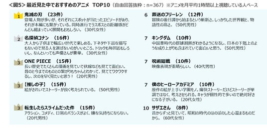 おすすめのアニメは、「鬼滅の刃」「名探偵コナン」「ONE PIECE」「【推しの子】」「転生したらスライムだった件」などがあげられた。伏線なども見てて面白い、ストーリーが単調ではなく、考えさせられるといったストーリーの面白さ、見ごたえについての声がみられた。<図5>
