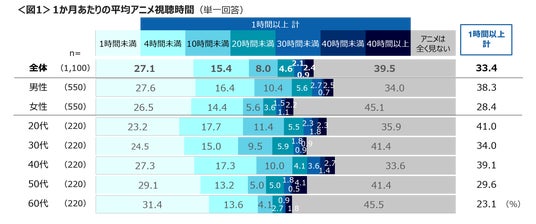 1か月あたりのアニメの平均視聴時間は、「1時間未満」が27.1%で、「1時間以上」見ている人は33.4%。