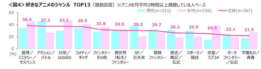 好きなアニメのジャンルは、「推理/ミステリー/サスペンス」「アクション/バトル」「日常/ほのぼの」「コメディ/ギャグ」が上位。