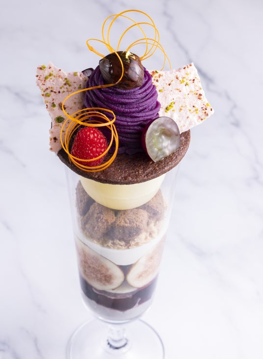 イチジクと巨峰など秋のフルーツをふんだんに使用した風味豊かなパフェは、温かいラズベリーソースをかけて楽しむユニークな演出が特徴。層になった構成は見た目も美しく、トップには紫いものモンブラン、中には、黒ゴマのブランマンジェ、ぶどうジュレなどが入った味わい深い一品です。