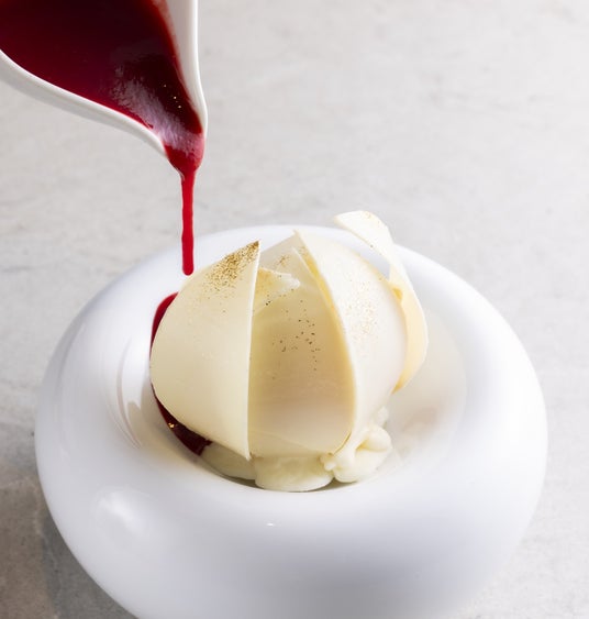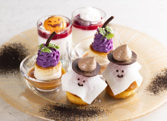 また、ドリンクとデザートの追加オプションも新登場。ペストリーシェフ 山口 慎吾(やまぐち しんご)の特製デザート「ショコラシュルプリーズ」は、フランス語でサプライズを意味する通り、温かいラズベリーソースをかけるとホワイトチョコレートの花が開く仕掛けで、その中には秘密のスイーツが隠されています。コウモリ型のチョコレートが付いた特別ドリンク「ハロウィンモクテル」は、サングリアシロップ、クランベリージュース、ブルーキュラソーシロップを使用した、さっぱりとした一杯です。