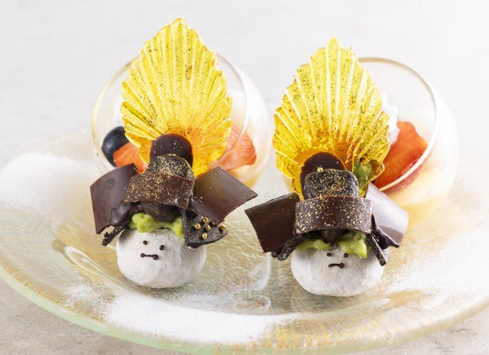 上段:豊臣秀吉の兜仕立てチョコレート、パンプキンのあんみつ イメージ