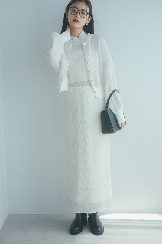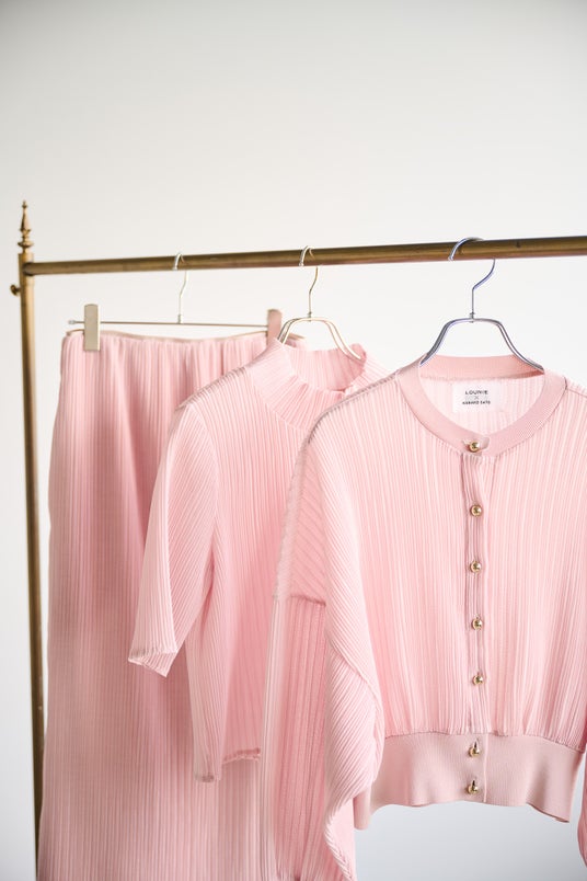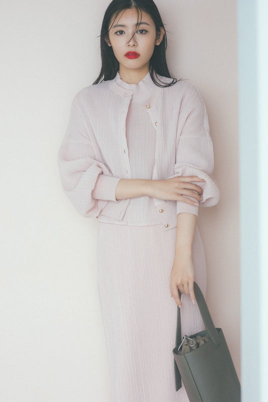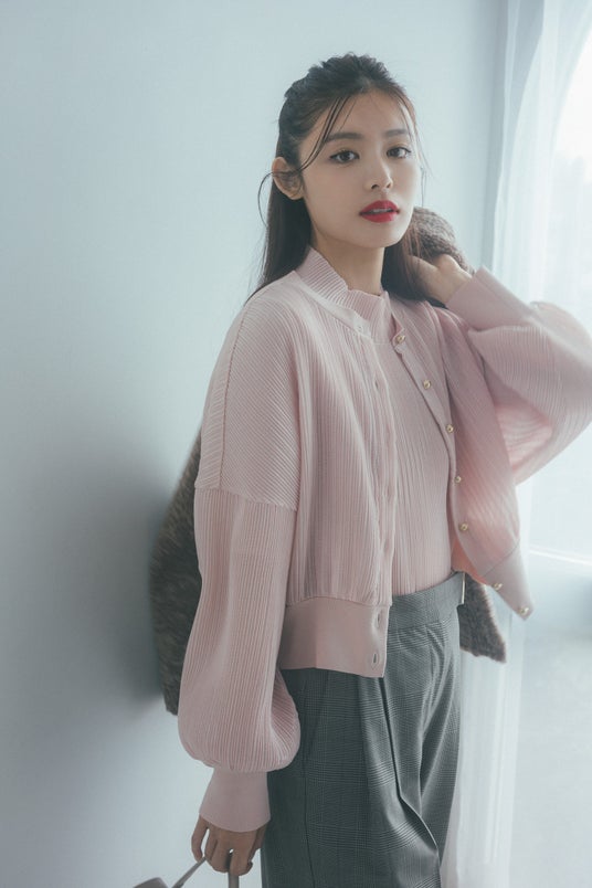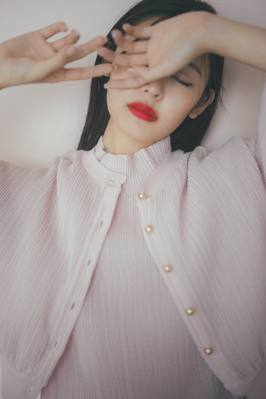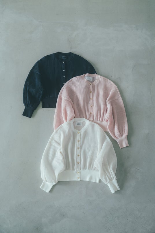 プリーツ調ショートカーディガン・ニットリブのアクセント、コロンとしたボタン使いが特徴。