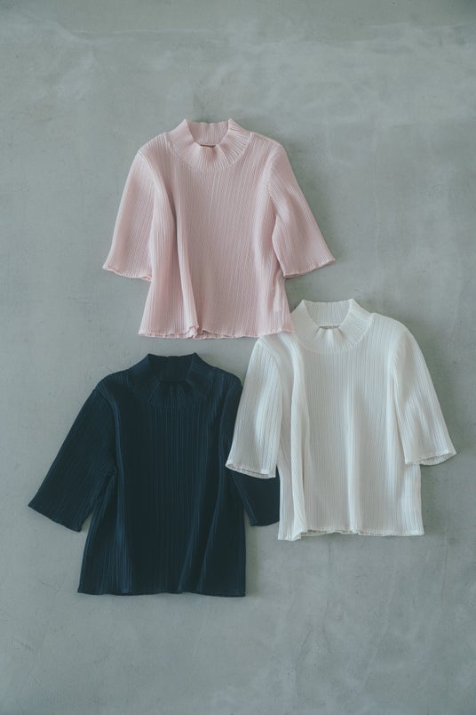プリーツ調ハーフスリーブプルオーバー・ハイネックできちんと感&上品な印象に