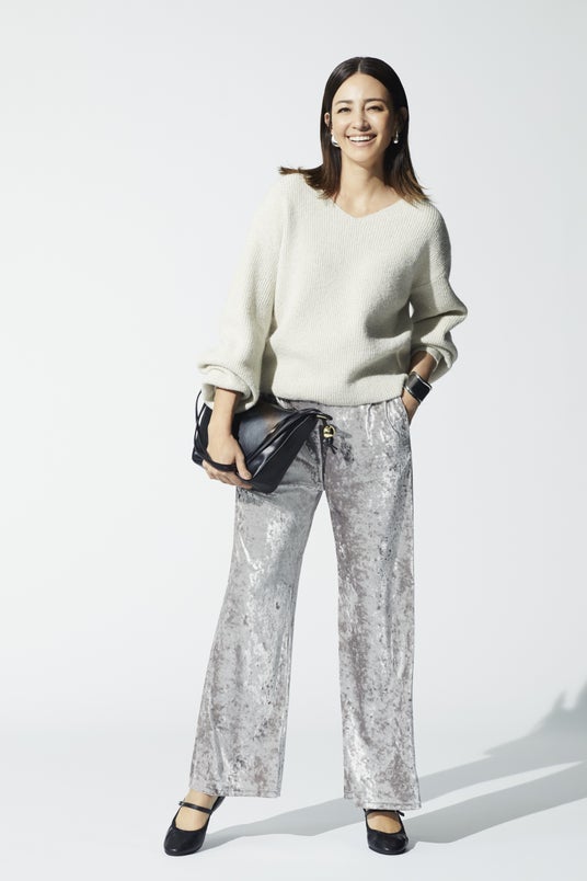 RINAさんに着用いただいた、今年初登場の「ラメ映えニット」は、ラメ糸に加えてスパンコールを編み込んでいます。スパンコールの量を調整することで、大人女性が着用しやすいデザインに仕上げました。