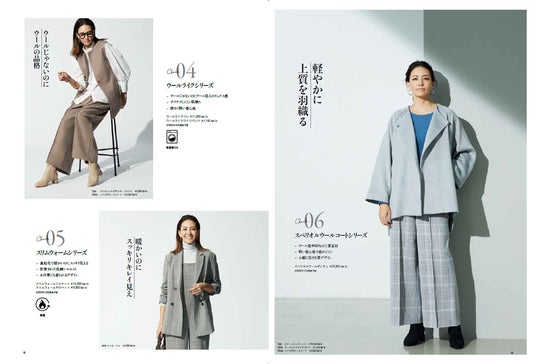 着るだけで顔回りが華やぐラメニットシリーズ、微光沢の表面感とゴールド金具が人気の大人リュクスマンパシリーズ、ブランド立ち上げ時から展開しているスペリオルウールコートシリーズを素敵に着こなしていただきました。