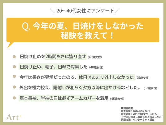今回は20~40代女性を対象に、今年の夏の日焼けについて・この秋注力したいスキンケアについて調査しました。今後もArt+は、忙しい日々の中でもキレイを叶えられるような情報について発信をしてまいります。