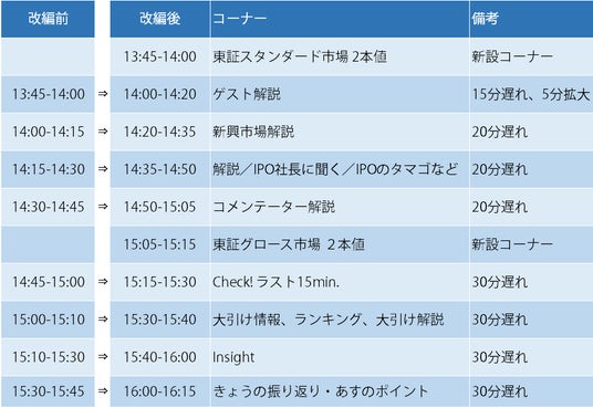 東証が後場の取引終了時刻を15時から15時30分に変更することに伴い、「昼エクスプレス」の終了時刻も現在の15時45分から16時15分に変更して、放送時間を30分延長します。