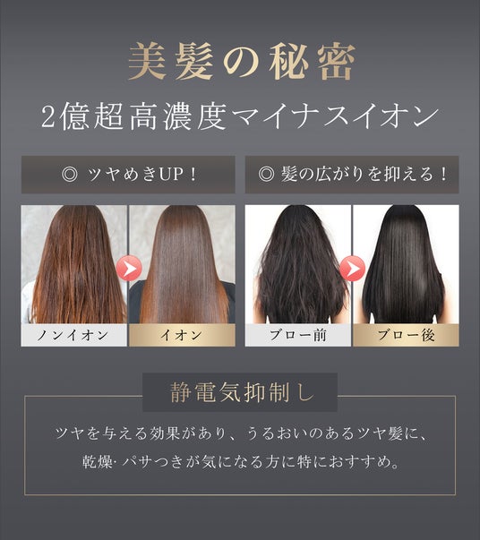 【髪へのやさしさ】2億超高濃度マイナスイオンで静電気を抑制し、髪にツヤと潤いを与えます。傷んだ髪の毛をイオンコーティングしながらケア。温冷リズムモードを搭載、 温風と冷風を自動で切り替えることで、髪と頭皮の両方をいたわりながら、ツヤのある仕上がりに。