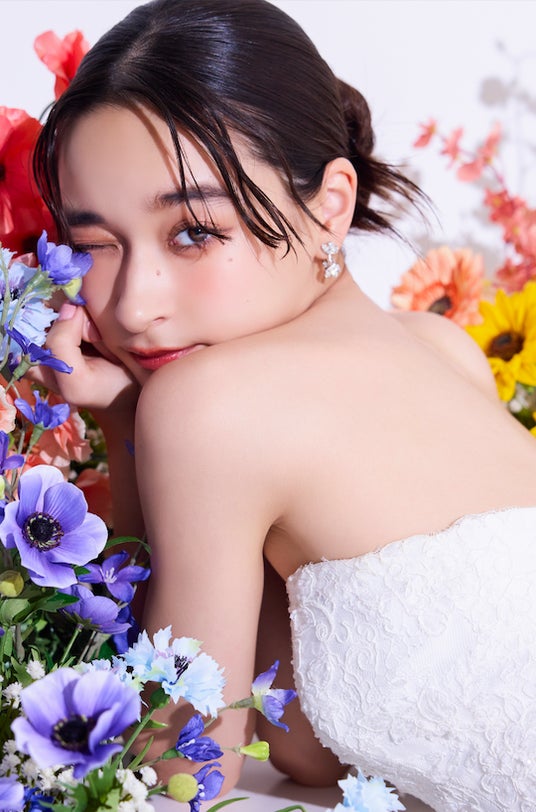 色味はワントーンで揃え、肌の質感や眉、リップの色合いをアクセントに美しさと可憐さを演出。