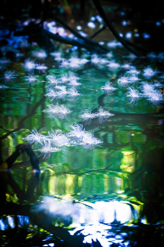 本展の開催にあたり蜷川実花とクリエイティブチーム・EiMは沖縄県の様々な場所を訪れ、地域の自然や風景を撮影しました。自身初となる水中での撮影にも挑戦しています。そのなかでも、夜咲いて朝には散ってしまう幻想的な植物 “サガリバナ” との出会いは、展覧会のタイトル 「光の中で影と踊る」という言葉へとつながっていく重要なもので、キービジュアルとして採用しています。