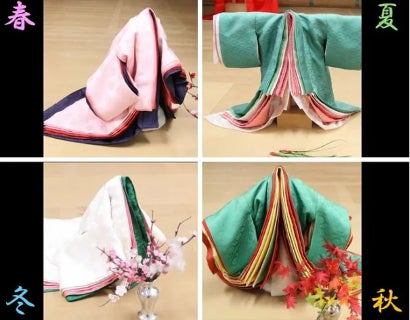 平安貴族は、季節によって、装束のかさねの色目を変化させて、おしゃれを楽しみました。京都・風俗博物館から借用する春・夏・秋・冬の「かさねの色目」で、合わせの色合いの美しさが楽しめます。