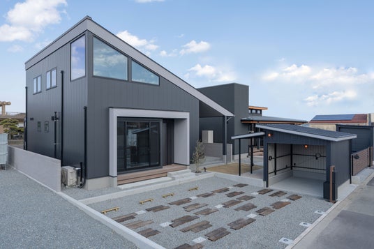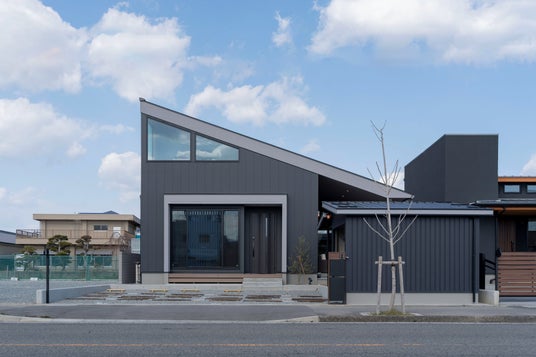 シャープな片流れの屋根とブラックの外壁が目を惹く