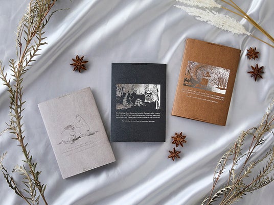 ノートを汚れや傷から守りつつ、ふせんやシールなどのアイテムを筆記の邪魔にならないように収納できる『STALOGY』の『ノートブックカバー』が、今回だけ特別にA6サイズになりました。裏面には『ムーミン谷の冬』の代表的なシーンの挿絵と名言を、銀世界を彷彿とさせるシルバーの箔押しで再現しています。異なるイラストを施したグレー、キャメル、ブラックの3色展開です。文庫本にも適応するサイズなので、ブックカバーとして使用することもできます。バッグの中でかさばらないコンパクトなサイズのため、日々の通勤や通学、外出時などに持ち歩きやすく、いつでもムーミンたちを近くに感じることができます。