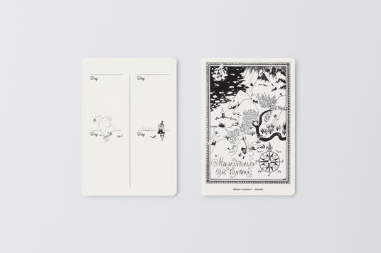 本製品はA6サイズの『ノートブックカバー』と『1/2イヤーノート』、『下敷き』の3点セットであり、購入後すぐにカバーをノートに装着し、使い始めることができます。『下敷き』はムーミン谷の地図とムーミン、リトルミイが印刷された特別デザインです。