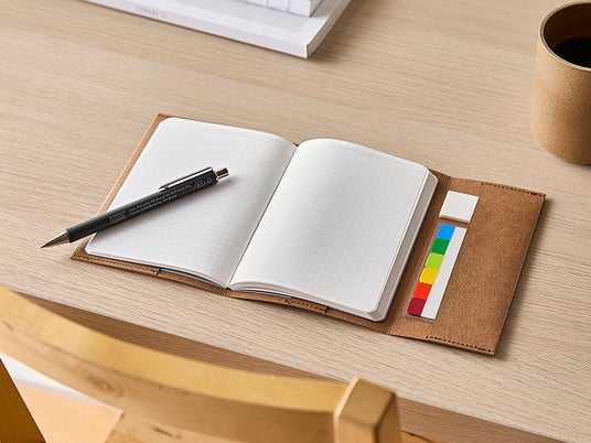 『365デイズノート』『1/2イヤーノート』の筆記のしやすさを損なわないように設計したノートカバーです。左右についたポケットは、筆記時にページの下で凹凸しないように設計しています。斜めにカットされた見返しの左ポケットは、カバーを装着する際にはノートの差し込み口を兼ね、素材の重なりが最小限になるようにしています。カバーの折り返し部分を活用した右ポケットは、ノートの外側に開く仕様にして筆記の邪魔にならないように工夫を施しています。また、右ポケットはノートのページに折り返すとブックマークにもなる、無駄のないデザインです。紙でありながら使うほどに風合いが出て、長く繰り返し使用できる丈夫でサステナブルな素材を採用しています。