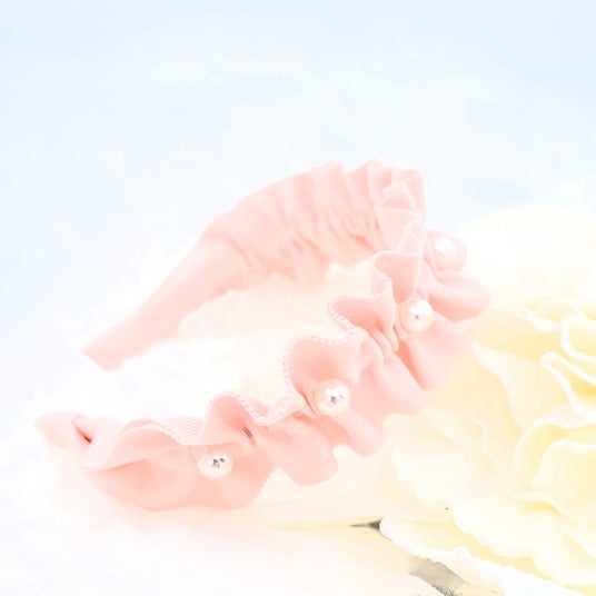 新しく登場した「Frills Ribbon×Perl Headband」は、フリルとパールが特長の華やかなカチューシャです。日本製のリボンに一つ一つ手作業でフリルをつくりました。
