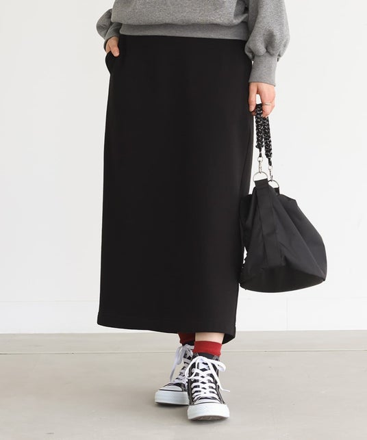 柔らかく暖かい裏シャギーカットソー生地のナロースカートは、ストレッチ性もあり、タイトすぎないデザインなので楽してすっきり見せが叶います。
