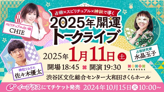 株式会社CAM(本社:東京都渋谷区、代表取締役社長:須田瞬海、以下CAM)は、運営する占いメディア「marouge(読み:マルージュhttps://marouge.jp/)」主催のトークイベント「水晶玉子・CHIE・佐々木優太【占術×スピリチュアル×神社】で導く2025年開運トークライブ」を渋谷区総合文化センター大和田 4階 さくらホールで開催することをお知らせいたします。
