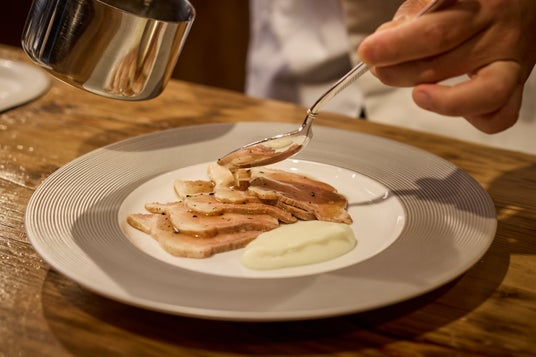 今回のコンソメドゥーブルは、コンソメを2回引くことで濃厚な旨味を作り出すクラシカルな手法のソース。黒トリュフを散りばめて、特別な時間を彩る贅沢な一品に仕立てました。