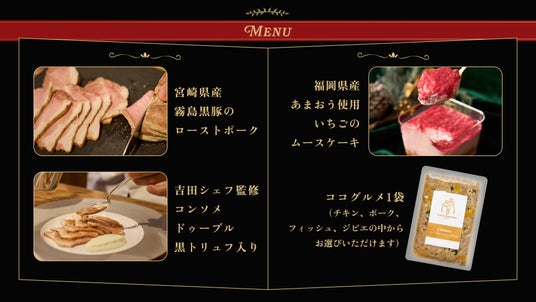 会員愛犬数25万頭(※1)を突破した愛犬用フレッシュペットフード(※2)「CoCo Gourmet(以下:ココグルメ)」、愛猫用「Miao Gourmet(以下:ミャオグルメ)」を開発・販売するスタートアップ、株式会社バイオフィリア(本社:東京都新宿区、代表:岩橋洸太)は、ココグルメの「シェアシリーズ」第二弾として、ミシュランのセレクテッドレストランシェフで、SNS総フォロワー数200万人超の実力派フレンチシェフ「Georgeシェフ」こと吉田能シェフがプロデュースした本格的なフレンチソースや宮崎県産霧島黒豚ローストポークが愛犬と一緒に食べられる、「ココグルメスペシャルホリデーセット2024」を販売します。