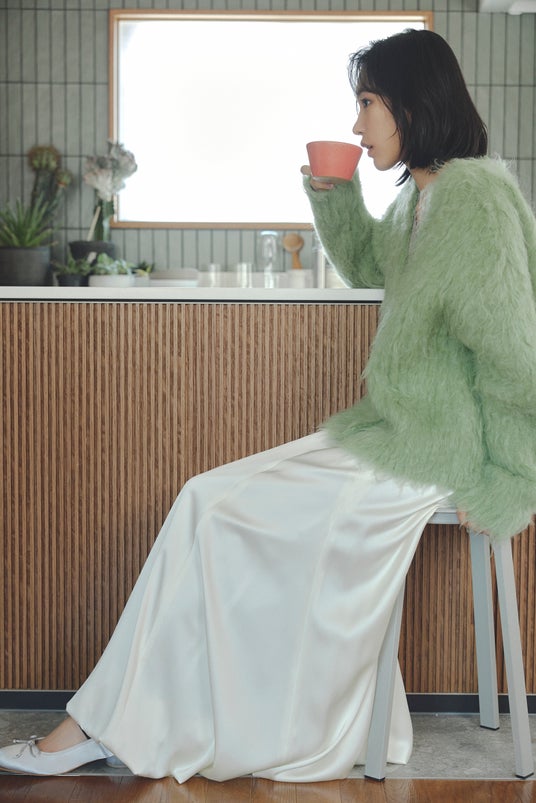 Shaggy cardigan ¥29,700 tax in,Knit cardigan ¥15,400 tax in,Skirt ¥23,100 tax in