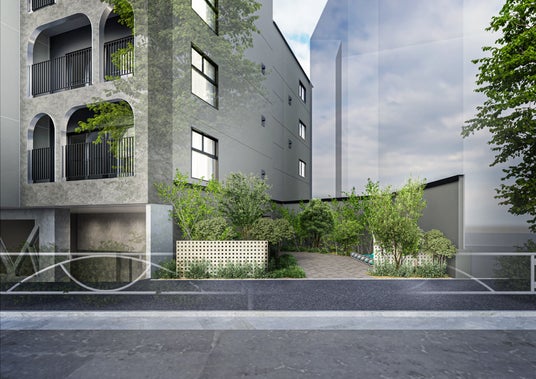 に、ペットの足洗い場や電動キックボードシェア「LUUP」置場を新設、エントランスアプローチとなる外構デザインを刷新し閑静な高級住宅街にふさわしい設えとしました。