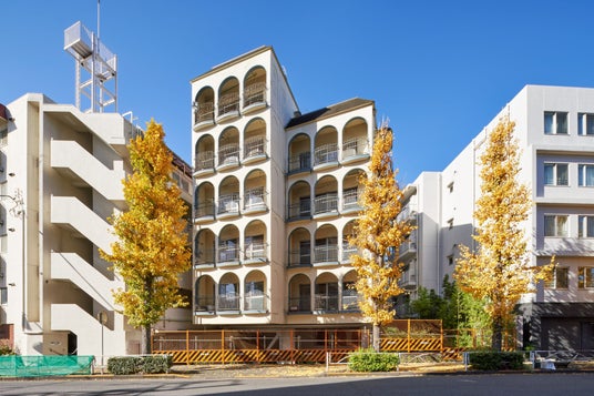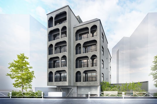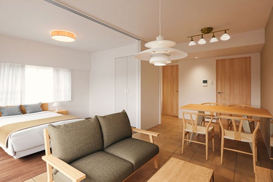 アーチが印象的なヴィンテージ感のある外観を活かしながら、多様な屋内環境を作り出すと共に、マンションエントランスなど共用部を含めた一棟全体をバリューアップ。ペットとの共生やガーデニングなど、忙しい日々の中でリフレッシュしたり、リラックスする時間を大切にしたい単身からDINKSをターゲットにリノベーションを進めています。間取りは、フルハイトの可働間仕切でワンルームとしても使える1LDKを中心に、最上階は一部スラブを解体し、下階とつなげることでルーフバルコニー付きメゾネット住戸を計画しました。また、暮らしやすさにこだわり、収納計画や家電・家具の配置などを考慮、内装デザインは、ナチュラルで温かみのあるテイストとし、ペット対応の床材や壁紙を採用するとともに、リビングはビニル床タイルとすることでインテリアのアクセントとしました。ガーデニングを楽しんだり、リビングの一画をインナーテラスのようにお使いいただけます。