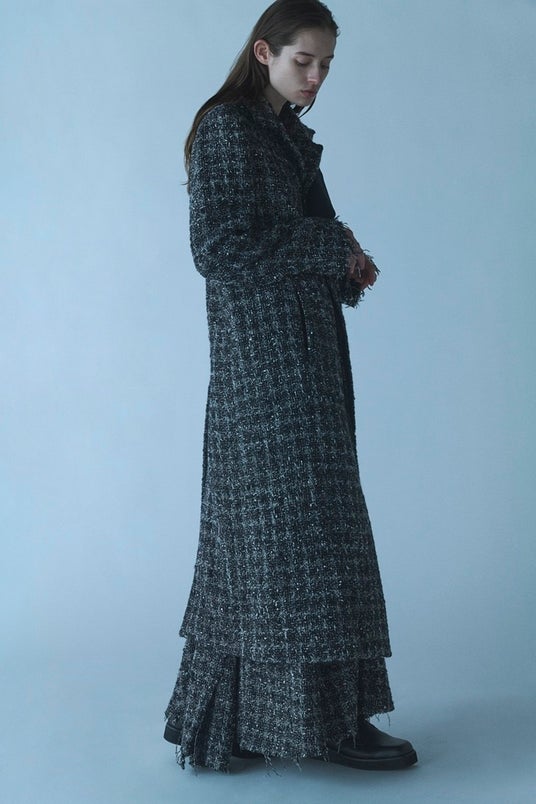 滑らかな肌触りのメルトン生地が形作る、シーズンを象徴する立体、花瓶のような襟元、ストールの流れが美しいアウターや、ホワイト、グレー、ブラックのモノクロームな色合いで構成された、様々なサイズの千鳥格子に、細かな色彩のツイードのセットアップなど、バリエーション豊かなラインナップが揃います。
