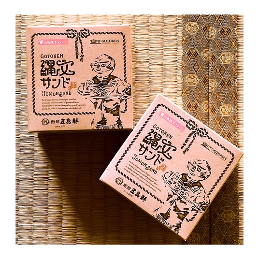 明治12年創業、函館の老舗洋食店「五島軒」が監修した、「北海道・北東北の縄文遺跡群」にある、約1万年前の地層がモチーフのお菓子「縄文サンド」。縄文時代の遺物や貝塚がのこる地層の断面を再現しています。※「縄文サンド」990円(税込)