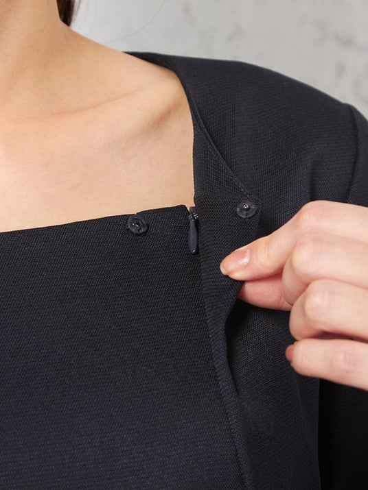 ワンピースはウエストをすっきりさせてメリハリのあるシルエットにすることで、スタイルアップが叶います。また前開きファスナーで着脱も簡単仕様も嬉しいポイントです。