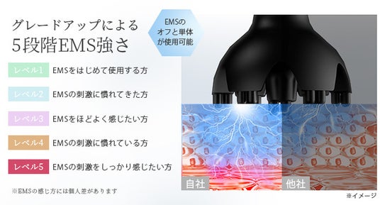 5段階で調整可能なEMS(電気筋肉刺激)機能で、頭皮だけでなく表情筋にもアプローチします。リラックスしながら頭皮の筋肉を効果的に刺激し、張りやコリを和らげます。ご使用時には、EMSレベルを選択できるため、初心者から経験者まで自分好みのケアが可能です。