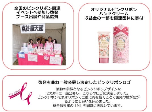 創業139年、美と健康を追求し続けている「桃谷順天館」(代表取締役社長 桃谷誠一郎、大阪市中央区)は、2005年から「ピンクリボン活動」を開始し、今年で19年目を迎えます。今年も、“ピンクリボン月間”である10月を中心に各地のイベントへの協賛や、社内でも啓発ブースを出し乳がんの早期発見・早期診断・早期治療の重要性を伝える活動を行っています。