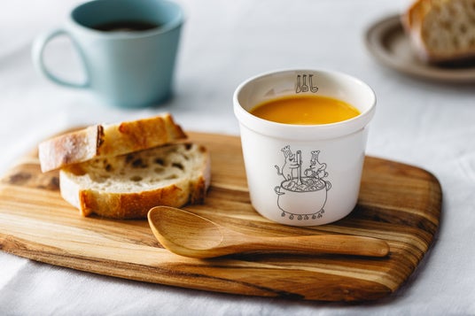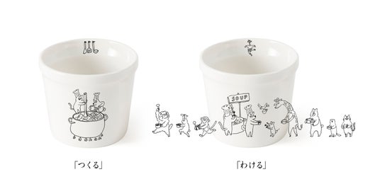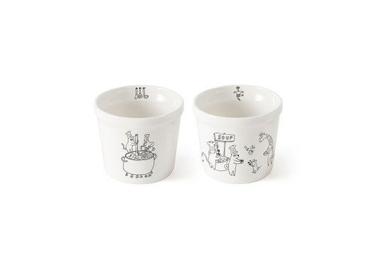2025年のSoup Stock Tokyoの「YEAR CUP」は、イラストレーターのカラシソエルさん描き下ろしの特別デザイン。スープをつくって、皆でわけるシーンが描かれた2 種類のYEAR CUPをご用意しました。カラシソエルさんらしい手描き感のあるやわらかいタッチと動物たちの表情やしぐさが愛らしく、心を和ませてくれます。