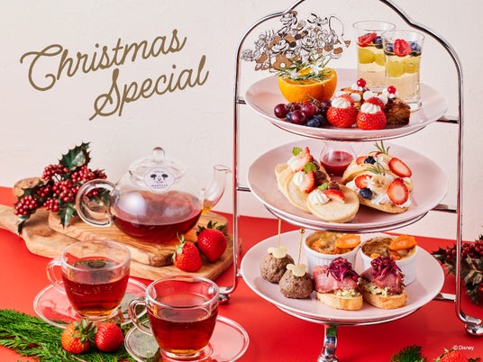ミッキーマウス風チーズを乗せたマッシュルームミートボールやドナルドダックの足型にんじんをのせた海老とホタテのミニグラタン、ローストビーフのタルティーヌなど、お食事メニューを楽しめるミールプレートなど、3種のバリエーション豊かなプレートを楽しめるクリスマス限定のアフタヌーンティーセットです。