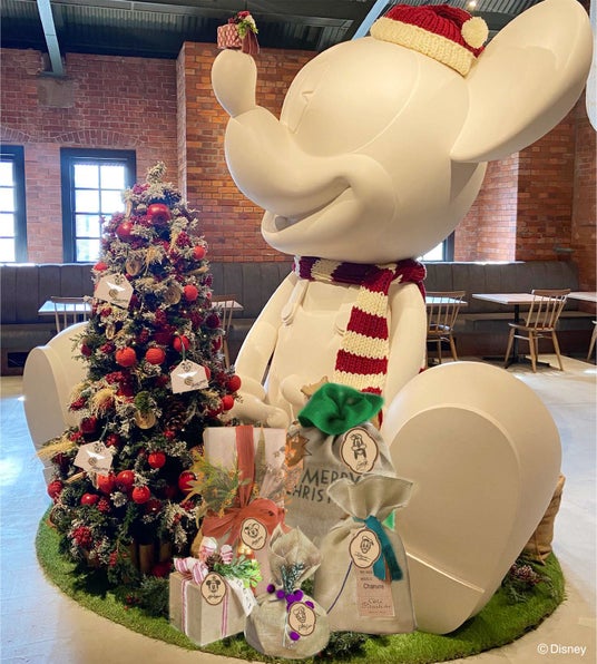 店内では高さ約2.7mの巨大なミッキーマウスをイメージしたスタチューがクリスマス仕様に。