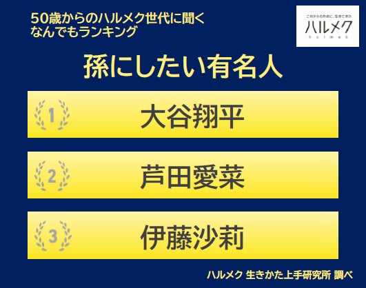 女性誌販売部数No.1(※1)雑誌「ハルメク」などのマーケティングやリサーチのコンサルティングを通じて、50代以上のインサイトを日々探求する「ハルメク 生きかた上手研究所」は、50歳以上の女性(事前調査434名、本調査565名)へのアンケート結果をもとにした「50歳からのハルメク世代に聞く なんでもランキング」を公開しました。テーマは「孫にしたい有名人は?」です。