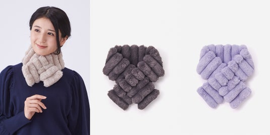 ファーのマフラーには縫製する際に静電気防止糸を使用することで、通常よりも静電気が起こりにくく、静電気によるまとわりつきやホコリの付着を軽減します。また、思わず手に取りたくなる、心躍るようなデザイン性を大切にし、「プードルファー ネックウォーマー」では肌触りにこだわり、何種類もの素材の中から何度も選び直しながら、素材を決定。「エコファー差込ミニティペット」では凹凸のあるファーがコーディネートのアクセントとなり、高級感漂うアイテムに仕上がっています。手袋の産地である四国の東かがわで生産した「スマホ対応クロス編手袋」は、あたたかでふわふわとした素材が特徴のマシュマロヤーンで編み立てています。肌触りの良さにこだわって天然シルクから抽出されたシルクたんぱくを生地にコーティングし、さらにハーブ成分(カモミールエキス)とカプサイシン(唐辛子)の働きによってあたたかいSelfHeater加工を施しています。