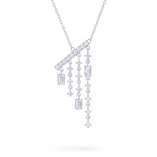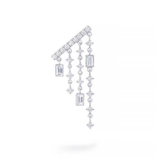 バゲットカットダイヤモンドとラウンドブリリアントカットダイヤモンドがまるで丁寧に織り上げられたシルクのように軽やかに動き、優雅な煌めきの余韻をもたらす「シャンデリア スウェイ」。繊細さと大胆さが共存するデザインに、プラチナの凛とした上質な輝きが加わります。
