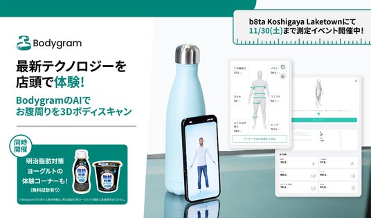 AIを活用した身体計測テクノロジー「Bodygram (ボディグラム)」を展開するBodygram Inc. (所在地:米国デラウェア州、CEO:Mark Van Winkle、公式サイト:http://bodygram.com/ja/、以下Bodygram) は、この度b8ta Koshigaya Laketownで展開される明治脂肪対策ヨーグルトの体験コーナー(無料試飲有り)にて、自社開発アプリ「Bodygram」をスペース内に設けられた測定セクションにてご利用いただく運びとなりました。ご希望の来場者様は、最新のAI技術を活用した3Dボディスキャンを無料で体験いただくことができ、「基本情報の入力」と「正面と側面の2枚の体型撮影」のわずか2ステップで、瞬時にご自身の3Dアバターをご確認いただけます。