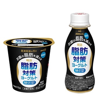 「明治脂肪対策ヨーグルト」シリーズは、体脂肪の蓄積を抑制することで肥満気味の方のお腹の脂肪を減らす機能が報告されているMI-2乳酸菌を使用した機能性表示食品です。食べるタイプの「明治脂肪対策ヨーグルト」は賞味期限を現在の17日から25日に延長し、「同ドリンクタイプ」は飲みやすくすっきりとした後味に改良されました。2品ともに毎日おいしく続けやすい低脂肪、砂糖不使用タイプです。