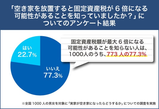 しかし、77.3%の人が空き家を放置すると固定資産税が6倍になる可能性を「知らなかった」と答えています。
